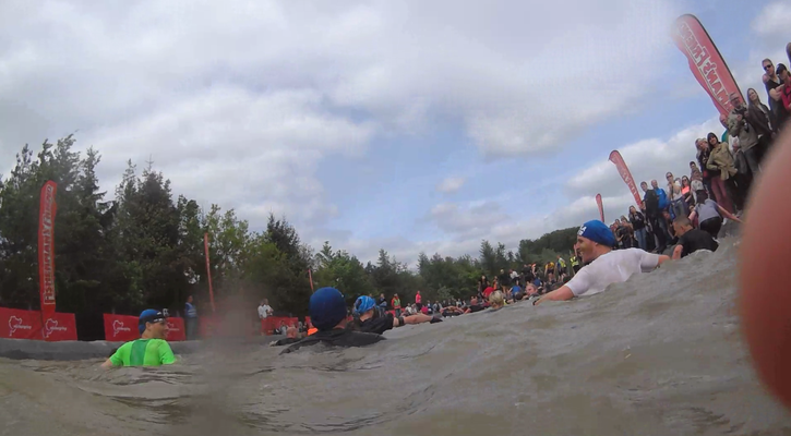 Ein letztes Mal ging es durch die Poolonaise, über die Holzleitern, auf die Halfpipe und zur Zielgrade. Die letzten Kräfte wurden mobilisiert um den Reifen-Hai zu überwinden und das Watergate zu besteigen. Es folgte die letzte große Rutschpartie und der letzte Container Tarzan.