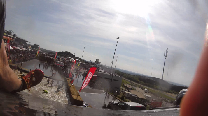 Danach folgte das berühmt berüchtigte Becken aus 20.000 Autoreifen, der Reifen-Hai. Das vorletztes Nürburgringhindernis war das Watergate. Tosende Wasserfälle, Kletterkonstruktion aus Holz, Überseecontainer und am Ende wartet eine riesen Rutschsause! Ein absolut krasse Konstruktion.
